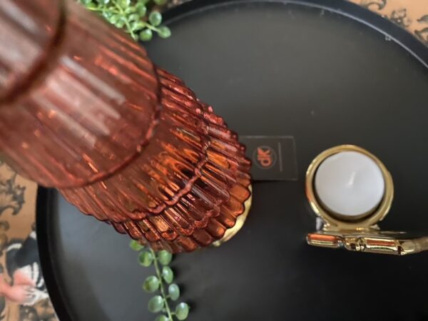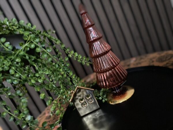 Deze set bevat: 1x Waxinelichthouder huis in de kleur goud. Wordt inclusief waxinekaarsje geleverd. 1x Decoratieve rode boom uit glas.
