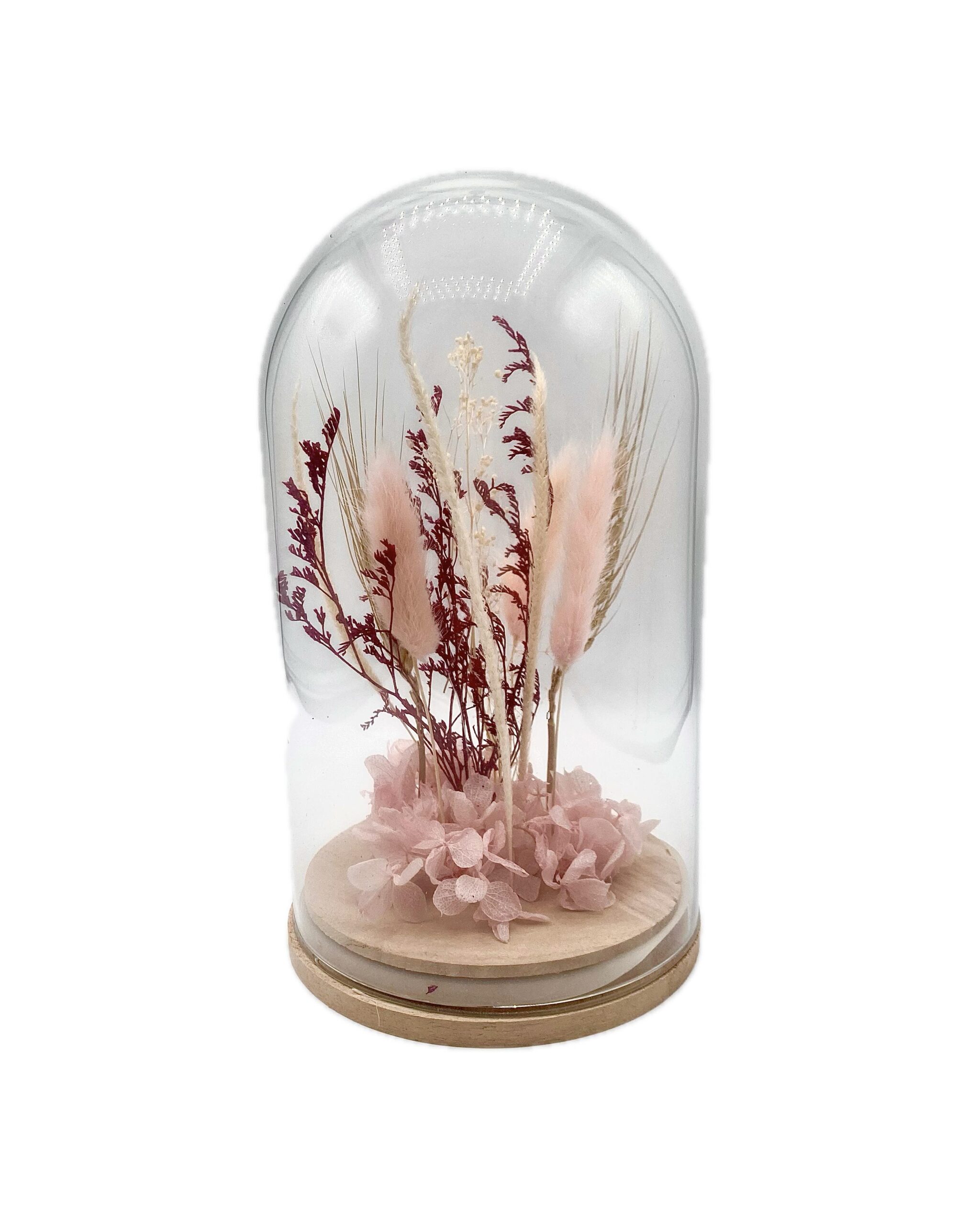 Helemaal hip deze stolp met droogbloemen. De stolp staat op een houten onderzetter.